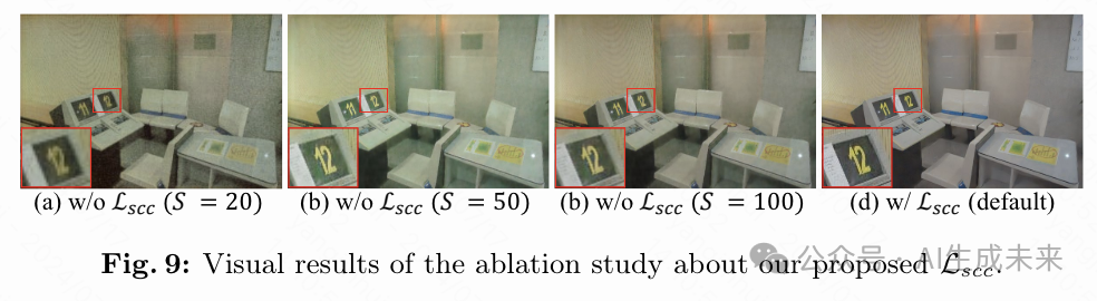 损失函数。 为了验证提出的自约束一致性损失 的有效性, 进行了一个实验, 将其从用于优化扩散模型的目标函数中移除。如上表 2 的第 8 行所报告的结果显示, 移除 会导致整体性能下降。此外, 将采样步长S增加到50和100, 评估使用纯扩散损失训练的扩散模型的性能,即公式(5),因为扩散模型生成的结果质量随着 的增加而提高, 如下图9所示。与第11行的默认设置相比, 将采样步长增加到 100 能够产生与使用 训练的模型相媲美的性能,但推理速度减慢了将近 4 倍, 这证明了损失函数可以帮助模型实现高效和稳健的恢复。