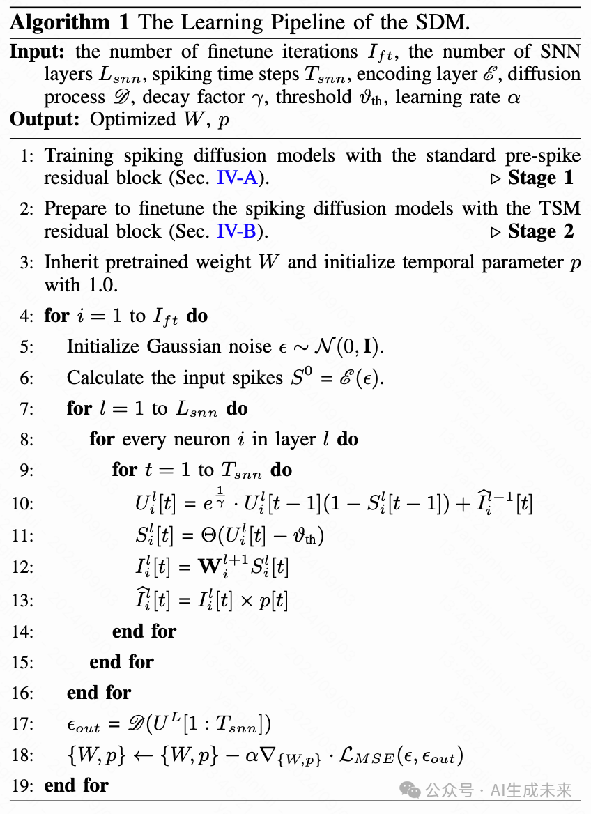 在下面算法1中精确描述了SDMs的整个学习过程。具体来说, 学习流程包括:(1)训练阶段和(2)微调阶段。在训练阶段, 本文首先使用预脉冲块训练SDMs, 然后在微调阶段利用TSM块对模型进行微调。本文仅使用少量迭代(如果 训练迭代次数)来微调本文的模型。值得注意的是, 由于 只是一个标量, TSM引起的额外计算成本可以忽略不计。通过计算 , 本文可以进一步优化 和 的参数, 以获得令人满意的网络。SNN-UNet和 的详细学习规则可以在附录中找到。