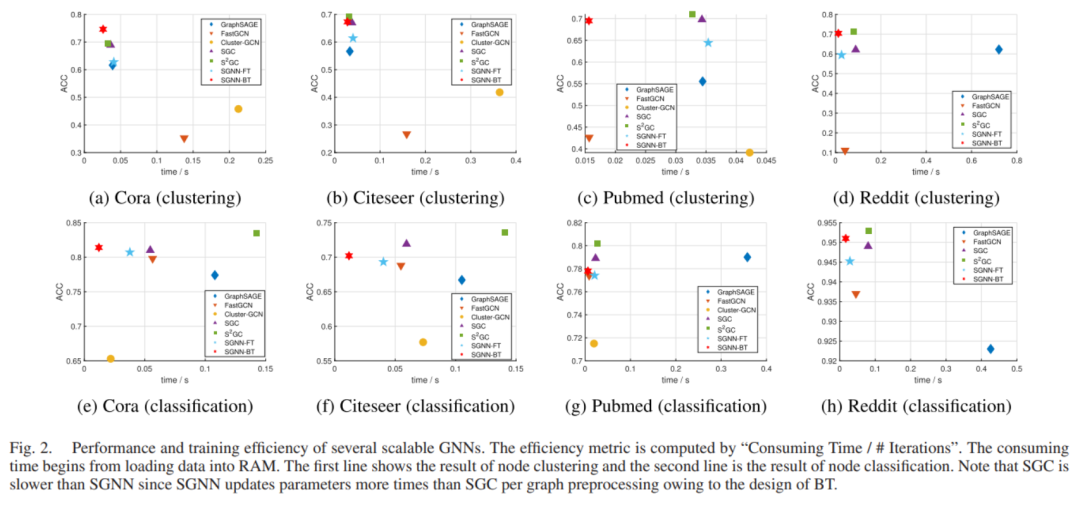 效率:图2显示了在Pubmed和Reddit上几种GNN的消耗时间,这些GNN具有更高的效率。我们不仅忽略了预处理操作,还测量了效率,即从将数据加载到RAM后开始,直到完成所有参数更新的总时间除以GNNs的更新参数总数。这种度量可以反映旨在将基于批量的算法应用于GNN的不同训练技术之间的真实差异。需要强调的是,SGC在消耗时间上比SGNN差的原因。关键是它们的预处理操作的成本不同。对于一个L阶SGC, 计算 的计算成本至少为 , 而具有L个一阶模块的SGNN总共需要 进行相同的预处理操作。该度量还为SGC和其他模型之间的公平比较提供了依据, 因为停止标准总是不同的。