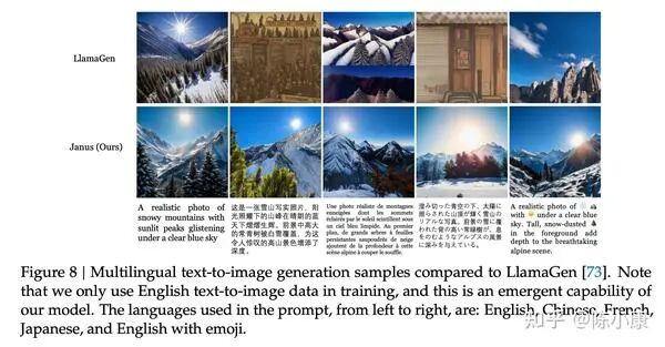 如 Figure 8 所示,我们还意外地发现,即使训练数据中只有英文文生图数据,但最后的模型涌现出了多语言文生图能力,如中文、法语、日语、甚至使用 emoji 都可以。我们认为这里的涌现能力来自于 LLM 预训练模型。