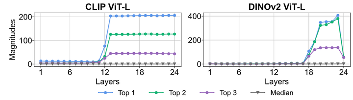 超大激活值是 ViT 中的偏置项。 图 16 显示了 CLIP 和 DINOv2 的 ViT-L 中每层的 3 个最大激活幅值和中值,这个结果是超过 1K 张图像的平均。可以发现超大激活值一直存在于图像中,并且其值在均值周围基本维持不变。而且,与 LLM 不同,超大激活值只出现在 ViT 的后期。