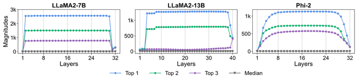 作者检查了3个模型:LLaMA2-7B、13B 和 Phi-2[4]。上图5为其中每个层的隐藏状态的3个 top 值及其中值。在 LLAMA2--7B 中,大量激活首先出现在第 2 层,并在第 30 层之前保持几乎恒定的值。有趣的是,对于 LLAMA2-7B 和 13B,大规模激活从一层计算中非常迅速出现,例如第 2 层和第 4 层。这意味着它们不会随着许多层的逐渐积累而出现,并且是由完全不同的机制引起的。
