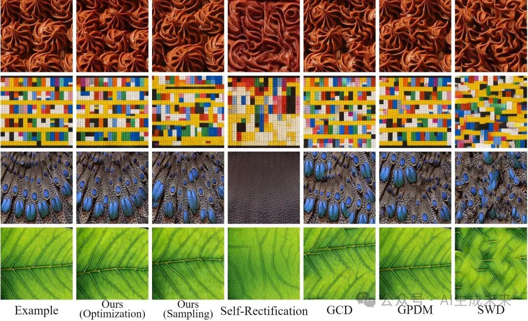 与基于补丁的神经纹理优化方法GCD相比,本文结果在保持可比纹理细节的同时展现了更平滑的物体边缘。相比之下,GCD存在颜色混叠的伪影问题;参见图9的第二行。最近,Self-Rectification引入了一种“懒编辑”控制,用于生成非平稳纹理。为了实现相同的目标,利用SDEdit来保留用户编辑的布局图像的结构。然后,将提出的AD损失和内容损失整合到采样过程中。如图9所示,Self-Rectification输出的纹理过渡更为平滑,而我们的结果更好地遵循了原始纹理示例。