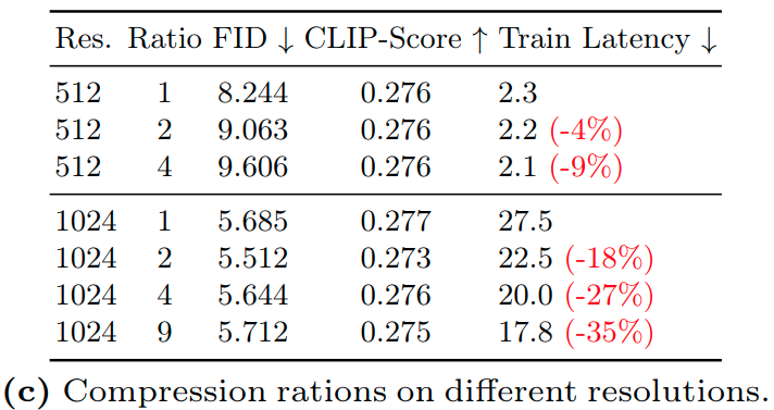 作者在图 11 中研究了不同压缩比对不同分辨率的影响。发现 Token 压缩不影响文本和图像 (CLIP Score) 之间的对齐,但会影响不同分辨率的图像质量 (FID)。尽管随着压缩率的增加,图像质量略有下降,但本文策略使训练速度提高了 18% 到 35%。