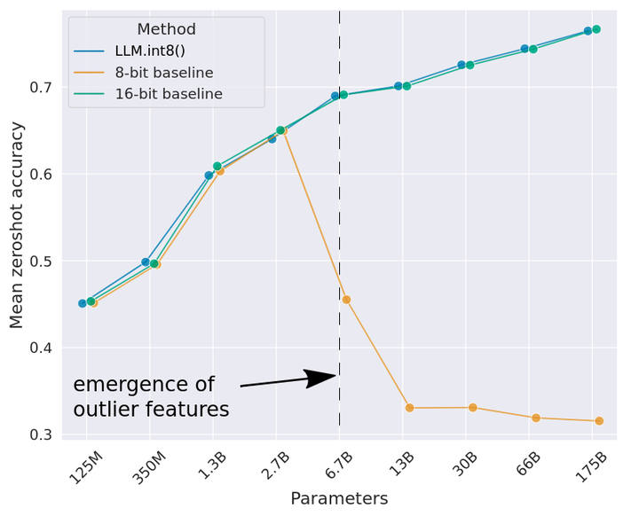 本文为 Transformer 的 FFN 和 Attention 的投影层开发了一个 Int8 矩阵乘法,在保持全精度性能的同时将推理所需的 GPU Memory 减少了一半。使用我们的方法,可以随时加载 175B 参数模型的 16/32-bit Checkpoint,转换为 Int8,随时使用而不会导致性能下降。本文方法理解并处理了 Transformer 中存在的异常值特征 (Outlier Feature),这些特征主导了 Transformer 的性能。