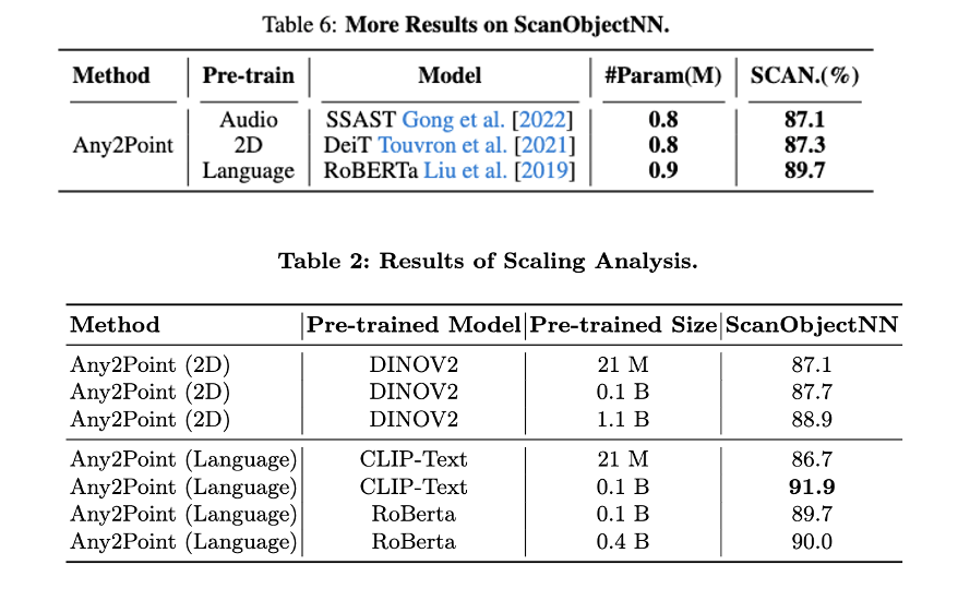 我们在ScanObjectNN数据集的“PB-T50-RS”上选择RoBERTa(1D)、DeiT(2D Vision)和SSAST(音频)作为预训练模型,微调设置与我们之前的实验一致, 进一步验证了我们的发现--无论是在ScanObjectNN还是ModelNet40数据集上,Any2Point框架都保持了1D模态(语言)表现优于2D模态(图像和音频)的性能趋势。我们猜测,由于预训练数据的原因,大型语言模型与其他模态相比拥有更强的语义信息,这有利于深入理解不同的3D对象。同时在 ScanObjectNN 数据集的“PB-T50-RS”上,2D & language预训练模型的大小增加可以增强 Any2Point 的性能。