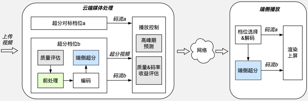 无论是主动下发还是被动下发低分辨率和低码率视频,端侧超分可以有效提升最终呈现在消费终端的画面质量。对于视频内容平台来说,可以进一步结合云端处理能力和系统策略设计超分下发档位,从而进一步提升端侧超分后视频质量,在节省带宽的同时最大化保障用户体验质量。图 3.3 展示了端云结合超分框架。方案简述如下: