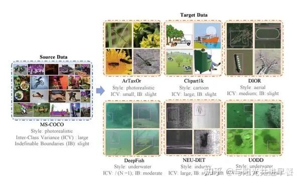 3. 右图: 相比于in-domain的小样本物体检测,跨域小样本物体检测通常会面临三个问题:1)目标域T的类间距离(ICV)通常较少;2)目标域的图像可能会出现前景与背景边界模糊(Indifinable Boundary,IB);3)目标域T得图像相交于源域S而言视觉风格(style)发生变化。