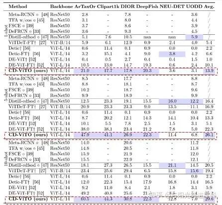 我们在1/5/10shot上与其他方法进行了对比实验,实验说明经过优化后的CD-ViTO方法在大多数情况下都优于其他的对比方法,达到了对基本DE-ViT的有效提升,构建了这个任务的新SOTA。