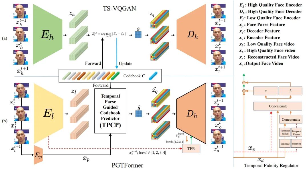 在这个阶段,研究者首先训练TS-VQGAN,该模型通过嵌入高质量的视频人脸先验信息,为PGTFormer后续的恢复任务提供了强大的基础。TS-VQGAN能够有效地捕捉和表示高质量人脸的空间和时间特征,生成与真实人脸非常接近的先验嵌入。这些嵌入在后续步骤中将作为PGTFormer的查询目标。 -