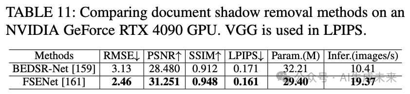 RDD 数据集用于训练和评估文档阴影去除方法,输入尺寸为 。结果如下表 11 所示,本文观察到 FSENet 在准确性和效率上显著优于 BEDSR-Net,使其在所有指标上成为更好的方法。
