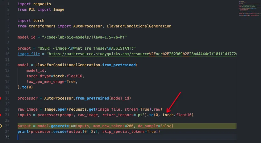 训练方式比较简单,主要操作是将视觉图像视作一种“外语”(相比于之前纯nlp,图像可以当做额外输入的外语),利用vision-encoder和projection[11]将“图像翻译成文本信号”,并微调LLM从而可以适应图像任务,我们简单看下其推理代码: