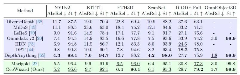 我们在NYUv2、KITTI、ETH3D等6个基准数据集上相对深度的定量评价,GeoWizard取得了相对SOTA的结果。尽管DepthAnything在其中三个真实数据集上获得了最好的定量数据,但它在域外图像上表现出明显的性能下降。这可能是因为尽管DepthAnything是在6350万张图像上训练的,但其判别性限制了它在与训练图像明显不同的领域上进行泛化的能力,另一方面,DepthAnything未能捕捉到丰富的几何细节。和鲁棒的深度估计器Marigold[5]相比,GeoWizard在前景布局上取得了更准确的结果。