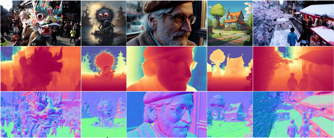 为此,来自香港中文大学、香港大学等机构的研究者提出了GeoWizard,该模型能够为任何场景的图像 (甚至是由 AIGC 生成的图像) 生成高质量的深度和法向信息。相比于传统简单的提升训练数据和计算量,研究者利用了已在数十亿张图像上预训练的扩散模型Stable Diffusion的先验知识,从而只需在少量高质量的数据(26w)上微调就可以取得具有强大的泛化性。