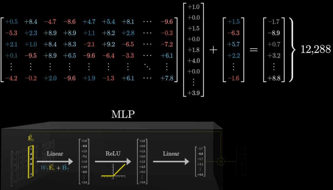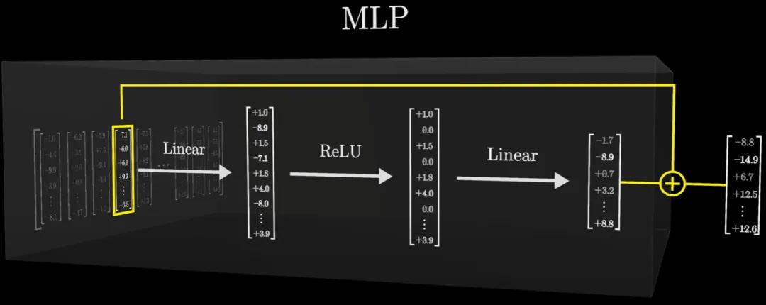 当这个编码了上述文本的向量序列穿过一个 MLP 模块时,该序列中的每个向量都会经历一系列运算:
