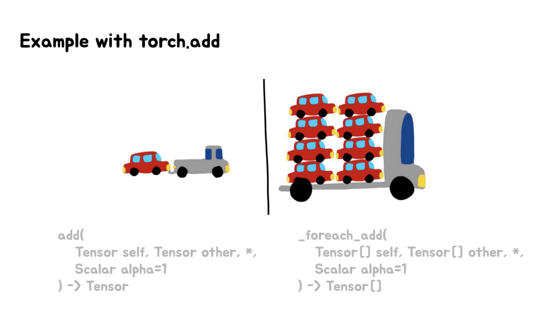 上面最后一张Slides,对比了普通的torch.add操作(左侧小车+小卡车)和_foreach_add操作(右侧大卡车装载多辆小车)。
