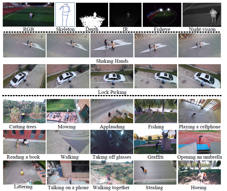 UAV-Human是一个用于使用无人机理解人类行为的大型数据集。包含67428个多模态视频序列和119个动作识别对象,22476帧姿态识别,41290帧1144个身份重新识别,22263帧属性识别。该数据集由飞行无人机在多个城市和农村地区进行为期三个月的白天和夜间采集,涵盖了主题、背景、照明、天气、遮挡、相机运动和无人机飞行姿态的广泛多样性。该数据集可用于基于无人机的人类行为理解,包括动作识别、姿态估计、重新识别和属性识别。