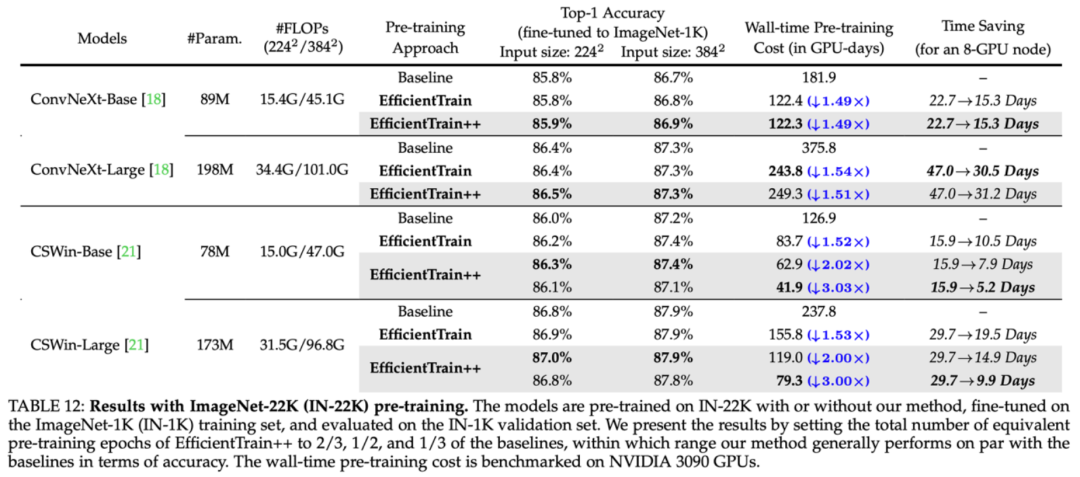 EfficientTrain++ 在 ImageNet-22k 上可以取得 2-3 倍的性能无损预训练加速。