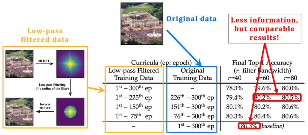图 6 研究了这个想法,即仅在特定长度的早期训练阶段对训练数据执行低通滤波,训练过程的其余部分保持不变。从结果中可以观察到,尽管最终性能提升有限,但有趣的是,即使在相当长的一段早期训练阶段中仅向模型提供低频分量,模型的最终精度也可以在很大程度上得到保留,这也与图 5 中「模型在训练初期主要关注学习识别低频特征」的观察不谋而合。