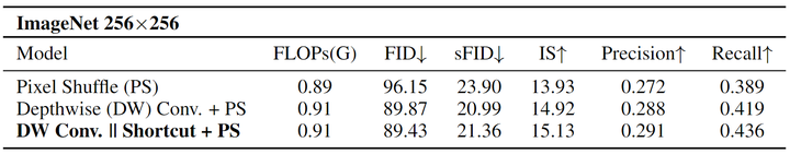使用下采样 tokens 的 Self-attention 的确有助于 DiT-UNet 扩散模型的性能提升。如上图3所示,FLOPs 显著减少,且 FID 指标还有轻微提升。