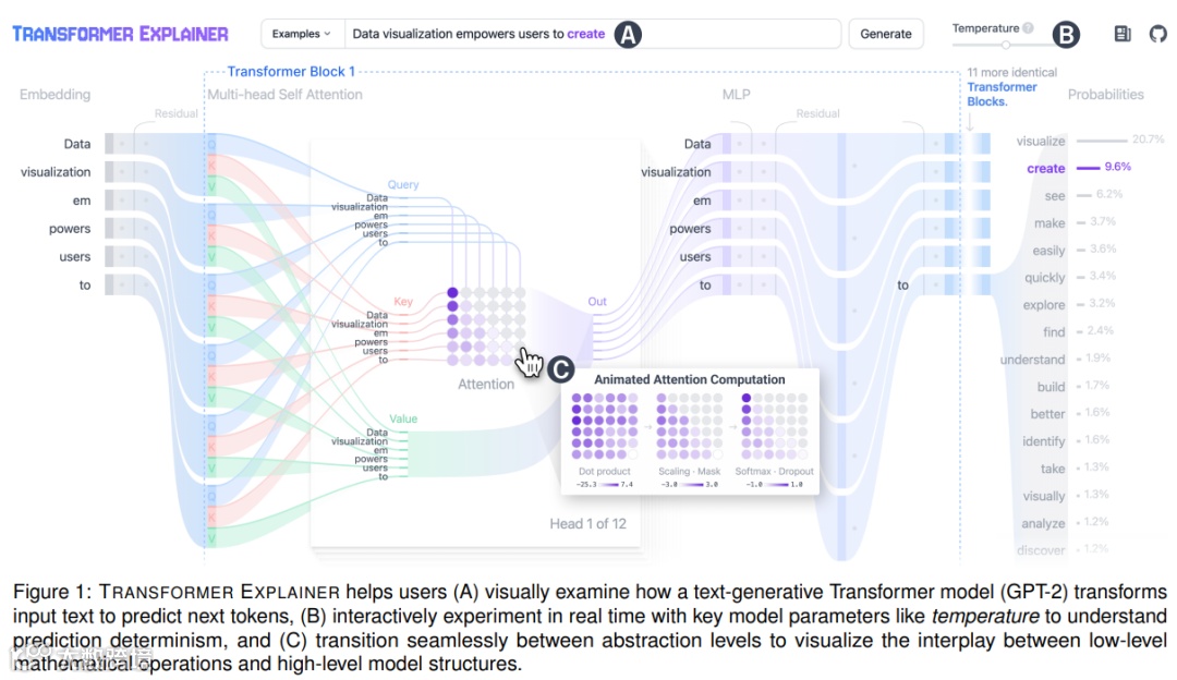因此,佐治亚理工学院和 IBM 研究院的几位研究者开发了一款基于 web 的开源交互式可视化工具「Transformer Explainer」,帮助非专业人士了解 Transformer 的高级模型结构和低级数学运算。如下图 1 所示。