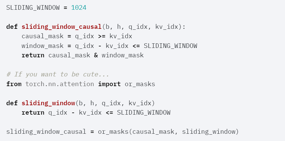 一些注意力变体包括因果注意力、相对位置嵌入、Alibi、滑动窗口注意力、PrefixLM、文档掩码、不规则张量、PagedAttention 等。更糟糕的是,人们通常希望将这些变体组合在一起!比如滑动窗口注意力 + 文档掩码 + 因果注意力 + 上下文并行,又比如 PagedAttention + 滑动窗口的组合。