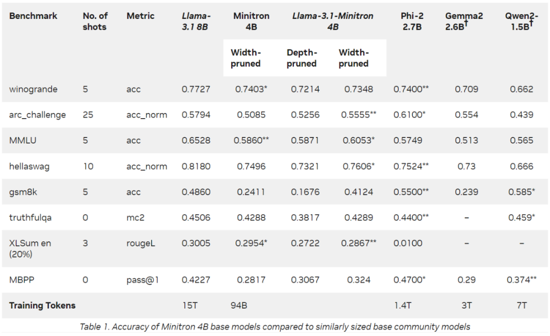 表 1:Minitron 4B base 模型相较于类似规模 base 模型的准确率比较。