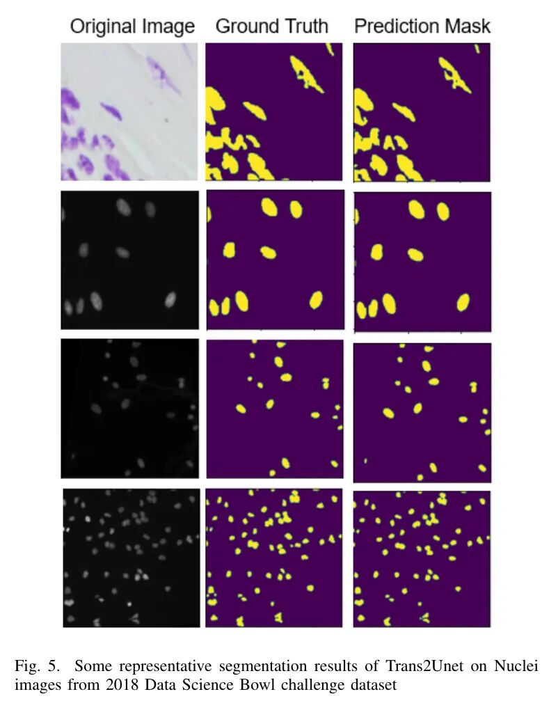 图5:Trans2Unet在2018年数据科学碗挑战数据集中的核图像分割的一些代表性结果。