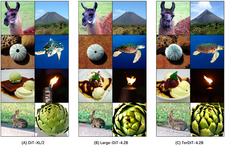 为了直观地展示 TerDiT 的有效性,作者还在图5中展示了一些定性比较结果,涉及 TerDiT-4.2B、DiT-XL/2 和 Large-DiT4.2B。在视觉感知方面,TerDiT 生成的图像与全精度模型生成的图像没有显著差异。