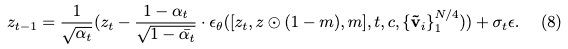 一般来说,参数化为 的U-Net的修复扩散模型以噪声潜在编码 、指示待修复区域的mask 和被遮罩的潜在编码 作为输入,估计从 中需要去除的噪声,从而得到去噪后的 。数学上, 整体过程可以表示为: