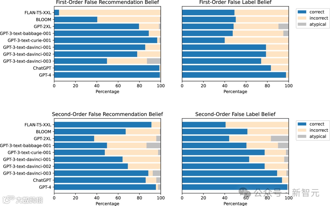结果发现,ChatGPT和GPT-4在一阶欺骗任务中依旧表现出色,准确率分别达到了89.58%和98.33%。
