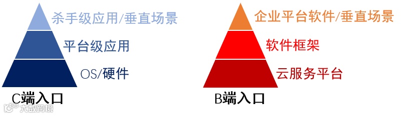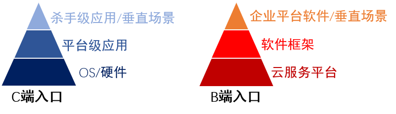 结合大模型应用生态,C端入口主要包括硬件(如iPhone)/ OS(如Windows)、平台级应用(如微信)、杀手级应用(如抖音)/垂直场景(如情感陪伴),B端入口主要包括云服务平台(如阿里云)、软件框架(如飞桨)、企业平台软件(如飞书)/垂直场景(如销售)。