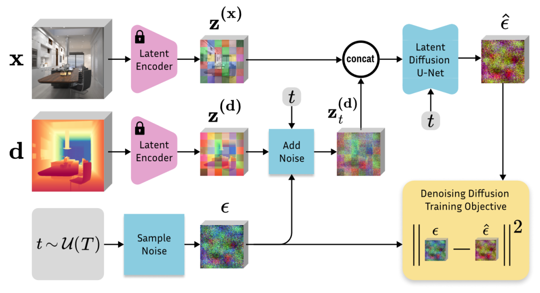 研究者提出将单目深度估计任务定义为一个条件去噪扩散生成任务。具体地,他们开发了Marigold模型,这是一个基于潜在扩散模型的框架,用于建模条件分布D(d|x),其中d代表深度,x是给定的RGB图像。通过逐步添加和移除噪声,模型能够从噪声数据中恢复出清晰的深度信息。训练过程中,模型通过对抗性学习调整参数,以最小化去噪扩散目标函数,从而有效地从输入的RGB图像预测出对应的深度图。这种生成式框架不仅提升了深度估计的准确性,也增强了模型对新领域数据的泛化能力。