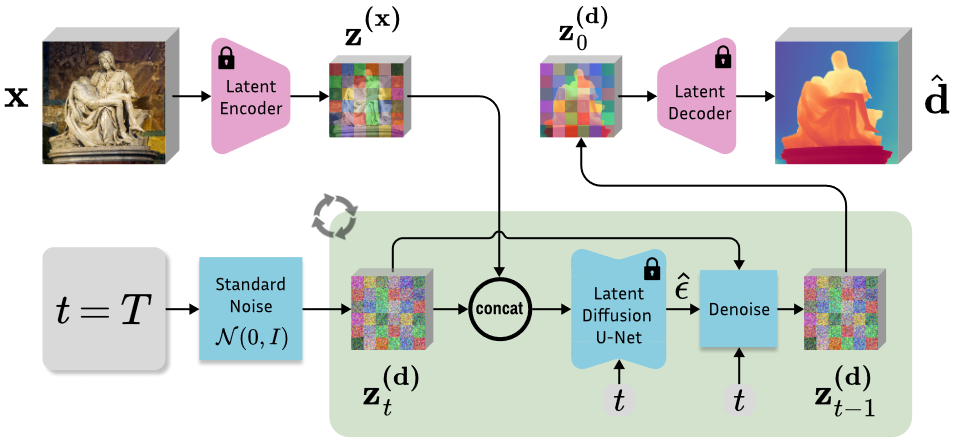 Marigold的核心是预训练的文本到图像的潜在扩散模型(LDM),主要进行了微调以适应深度估计任务。该架构包括一个冻结的变分自编码器(VAE)用于编码图像和深度信息至潜在空间,并结合使用特定的深度编码器和解码器。在去噪过程中,模型通过修改U-Net来实现对图像的条件编码,从而提高了训练效率并保持了高分辨率图像生成的能力。通过这种精心设计的网络架构,Marigold能够高效地处理深度估计任务,同时保留了强大的图像先验知识。