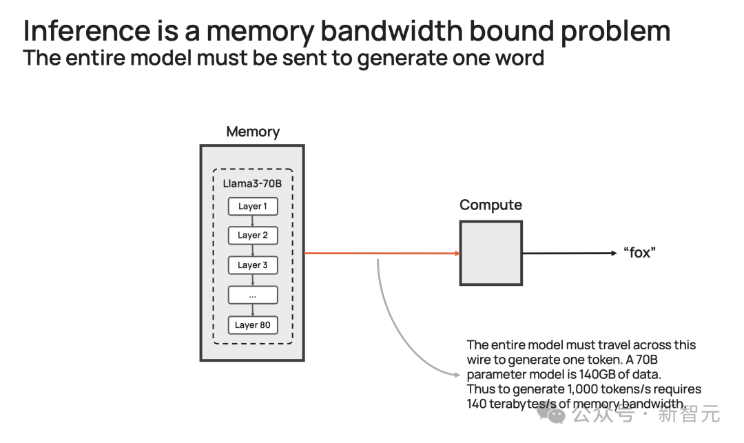 想要模型输出一个token,那700亿参数必须从内存,移动到计算核心,以执行前向推理计算。