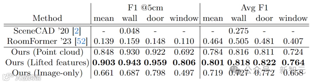 表中数据给出了Aria合成环境的布局估计,SceneScript方法与近期相关工作之间的定量比较。