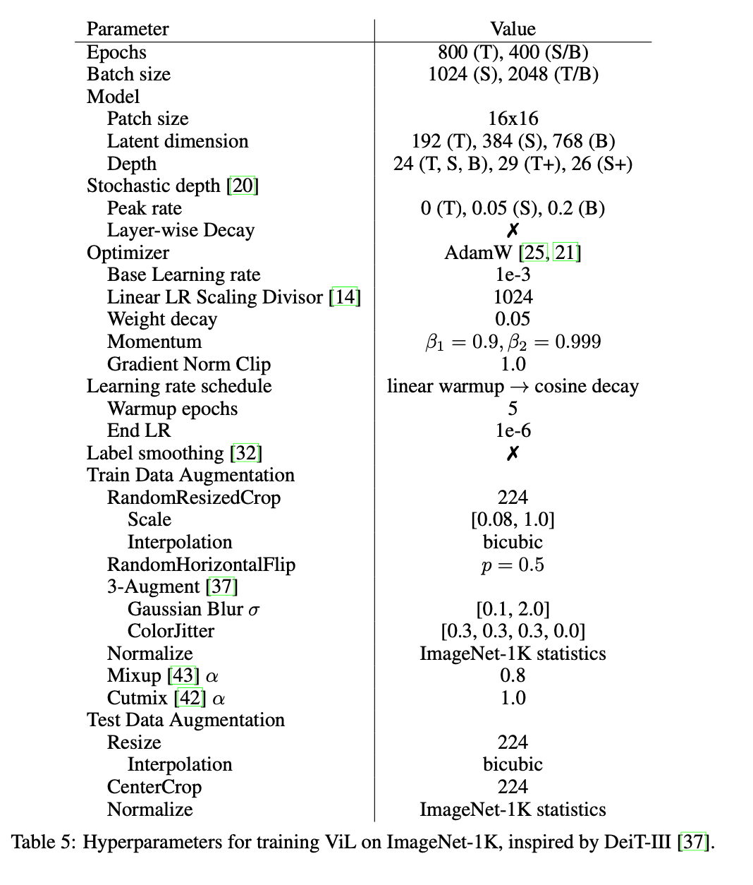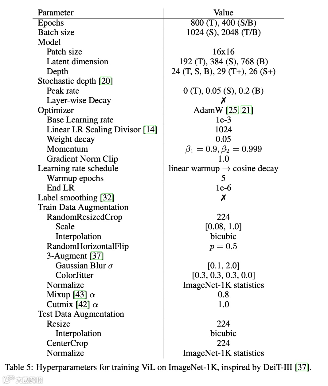 他们在 224x224 分辨率上训练 ViL 模型,使用余弦衰减调度,1e-3 的学习率训练了 800 个周期(tiny, tiny+)或 400 个周期(small, small+, base),具体见下方表 5.
