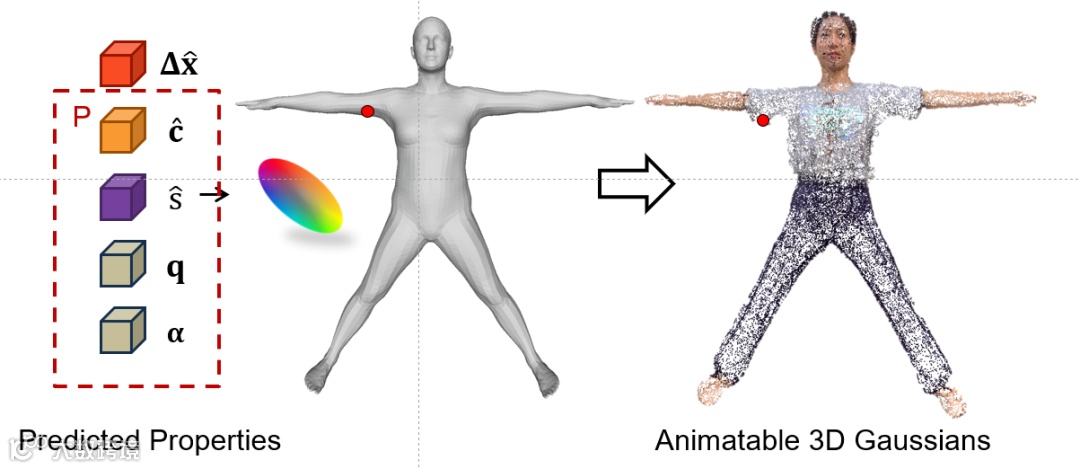 其中 表示渲染的图像, Splatting 表示3DGS的渲染过程, 表示线性混合蒙皮公式, 表示高斯点的位置, 它包含了SMPL/SMPL-X模型的表面点位置 和预测的空间残差值 表示高斯参数除了位置外的其余超参。他包括了预测颜色 , 预测尺度 以及固定的旋转向量 和透明度 。如图4所示, 这些预测和固定的高斯参数是定义在标准姿态的SMPL/SMPL-X模型下的, 用线性混合蒙皮即可完成驱动。