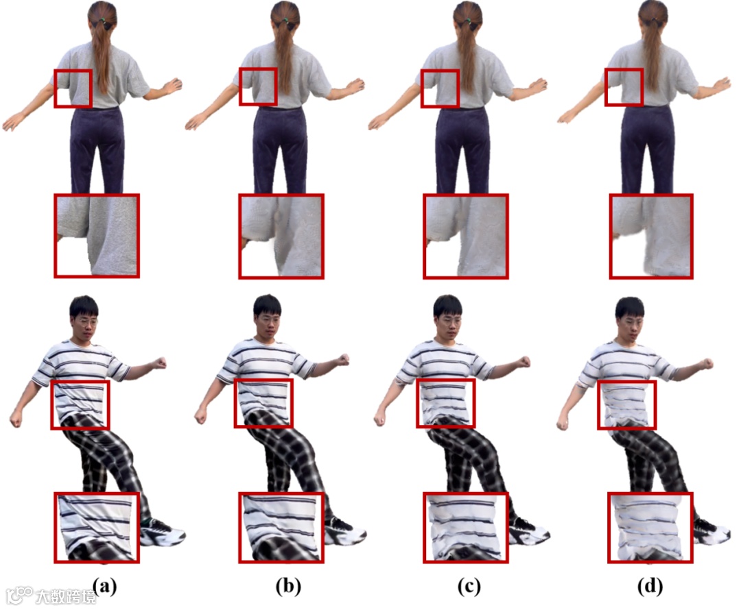 其中, 我们对估计的人体姿态 和人体位移 添加一个可优化残差 。这样我们通过前向蒙皮从标准姿态驱动到当前姿态优化人体动作, 能够比先前方法反向蒙皮过程对动作优化更为准确。