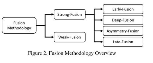 最新的融合任务为自主驾驶感知任务提出了一些创新的多模式融合方法。总的来说包括了两大类:即强融合和弱融合,以及强融合中的四个小类,即早期(前)融合、深度(特征)融合、后期(后)融合、不对称融合(这个表示两个分支的特征进行相互决策)
