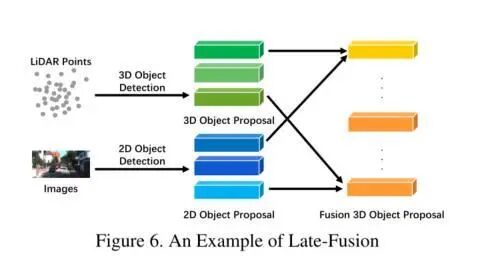 后融合,也称为目标对象级别融合,表示在每个模态中融合结果的方法。一些后融合方法其实是同时利用了LiDAR点云分支和相机图像分支的输出,并通过两种模式的结果进行最终预测。后期融合可以看作是一种利用多模态信息对最终方案进行优化的集成方法。