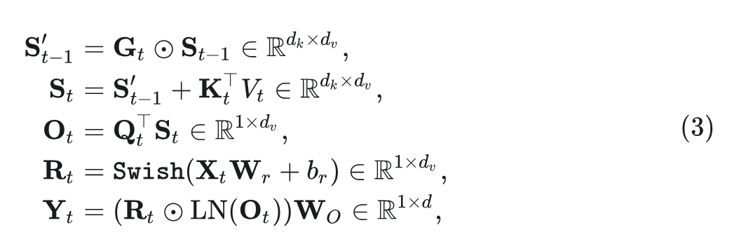 其中, Swish 是 Swish 激活函数, 是逐元素乘法运算。在接下来的部分中, 使用 来指代输入序列的门控线性注意力计算。