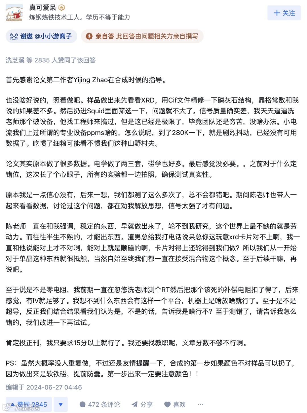 至于是不是超导,反正我们结合结果看我们认为是,不是的话,告诉我是啥行不?至于测错了,请告诉我怎么错的,我们改进一下再试试。