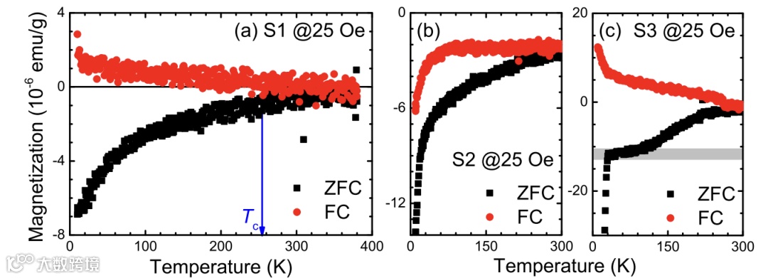 在25 Oe的零场冷却(ZFC)测量下,磁化率-温度(MT)曲线在260K(-13.15°C)以下显示出显著的抗磁性,而场冷(FC)曲线为顺磁性。ZFC和FC之间的分叉出现在250-260K(-23.15°C ~ -13.15°C),这可以视为临界温度Tc。