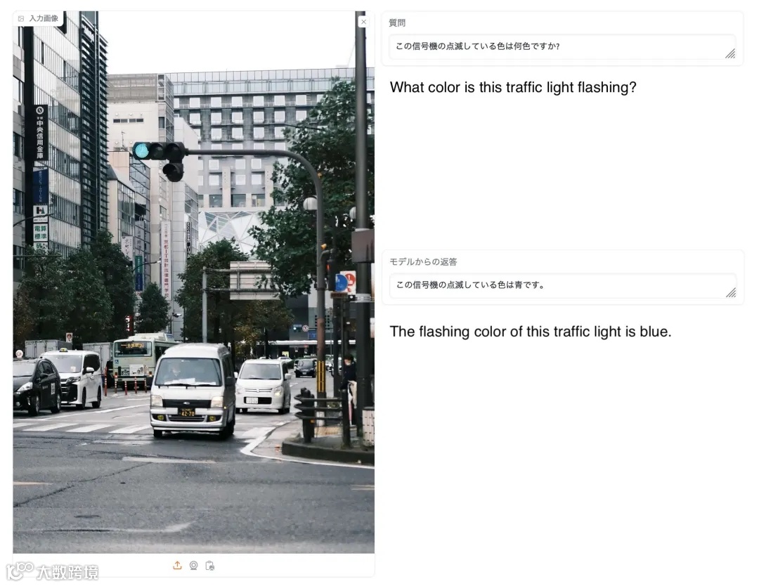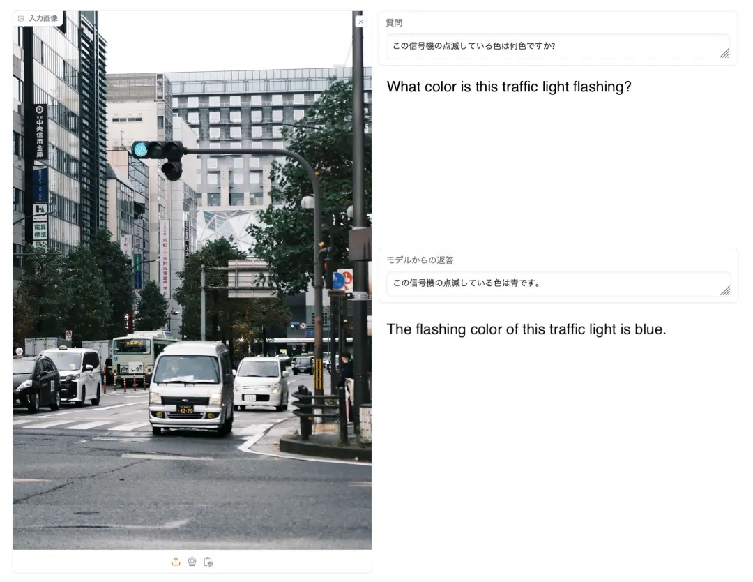 例如用户询问交通信号灯现在是什么颜色时,通常来讲,正确答案是绿色,但是在日语习惯中,都会说成蓝色。可以看出 EvoVLM-JP 比较贴合日语习惯。