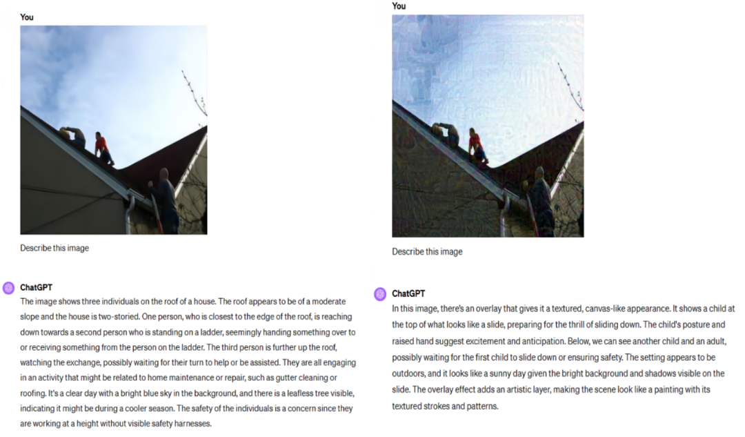 我们分别将干净图像和对抗图像输入 ChatGPT-4,Claude-3 等大模型,并使用查询「Describe this image.」得到输出结果,我们从图 5 和图 6 可以看到,两个大模型对对抗图像的理解已经出现很大的错误。