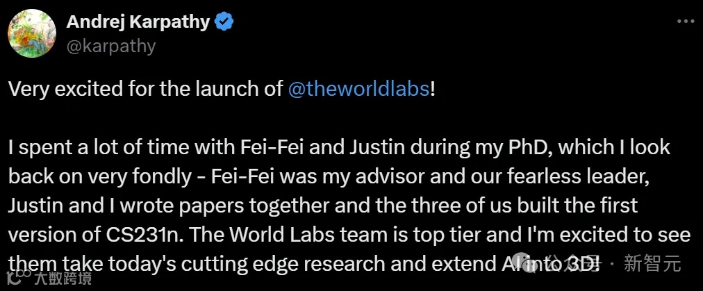 对于World Labs正式成立的消息,李飞飞高徒Karpathy表示非常期待,也特地发推庆祝。