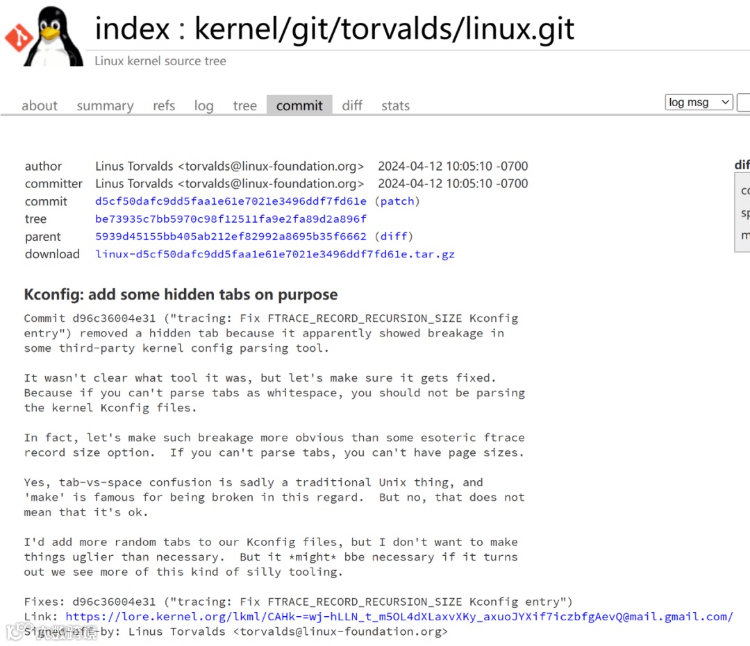 图源:https://git.kernel.org/pub/scm/linux/kernel/git/torvalds/linux.git/commit/?utm_source=anzwix&id=d5cf50dafc9dd5faa1e61e7021e3496ddf7fd61e