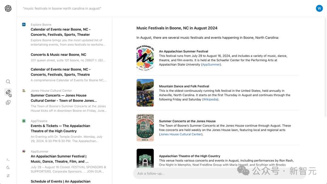 SearchGPT瞬间把几个相关的音乐节排列得清清楚楚,点击左侧边栏的链接按钮,还可以看到信息的来源,一键跳转买票。
