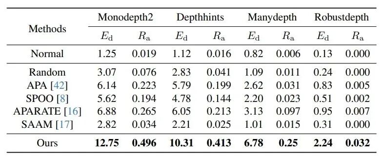 在物理世界的实验测试中,我们将纹理粘贴在汽车模型表面,测试对Monodepth2[10]模型的攻击效果,结果如下图表所示。